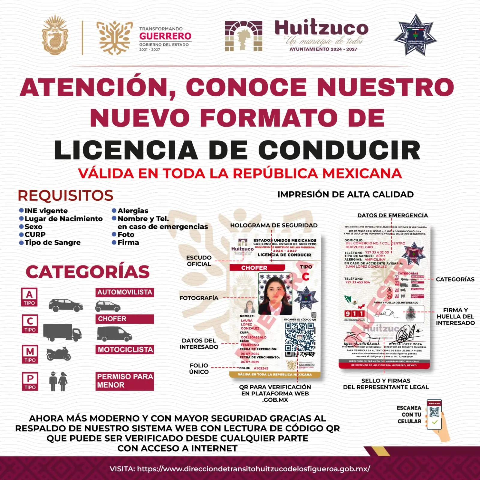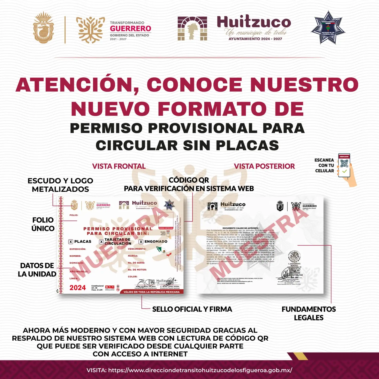 Lo puedes hacer mediante el código QR que se encuentra en el documento, o bien, puedes ingresar al sitio https://www.direcciontransitohuitzucodelosfigueroa.org.mx. De igual manera, lo puedes hacer vía telefónica al (727) 116 5900, o a través de correo electrónico a h_ayuntamiento@direcciontransitohuitzucodelosfigueroa.org.mx